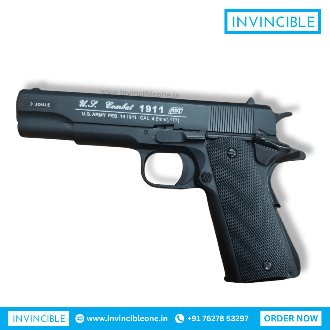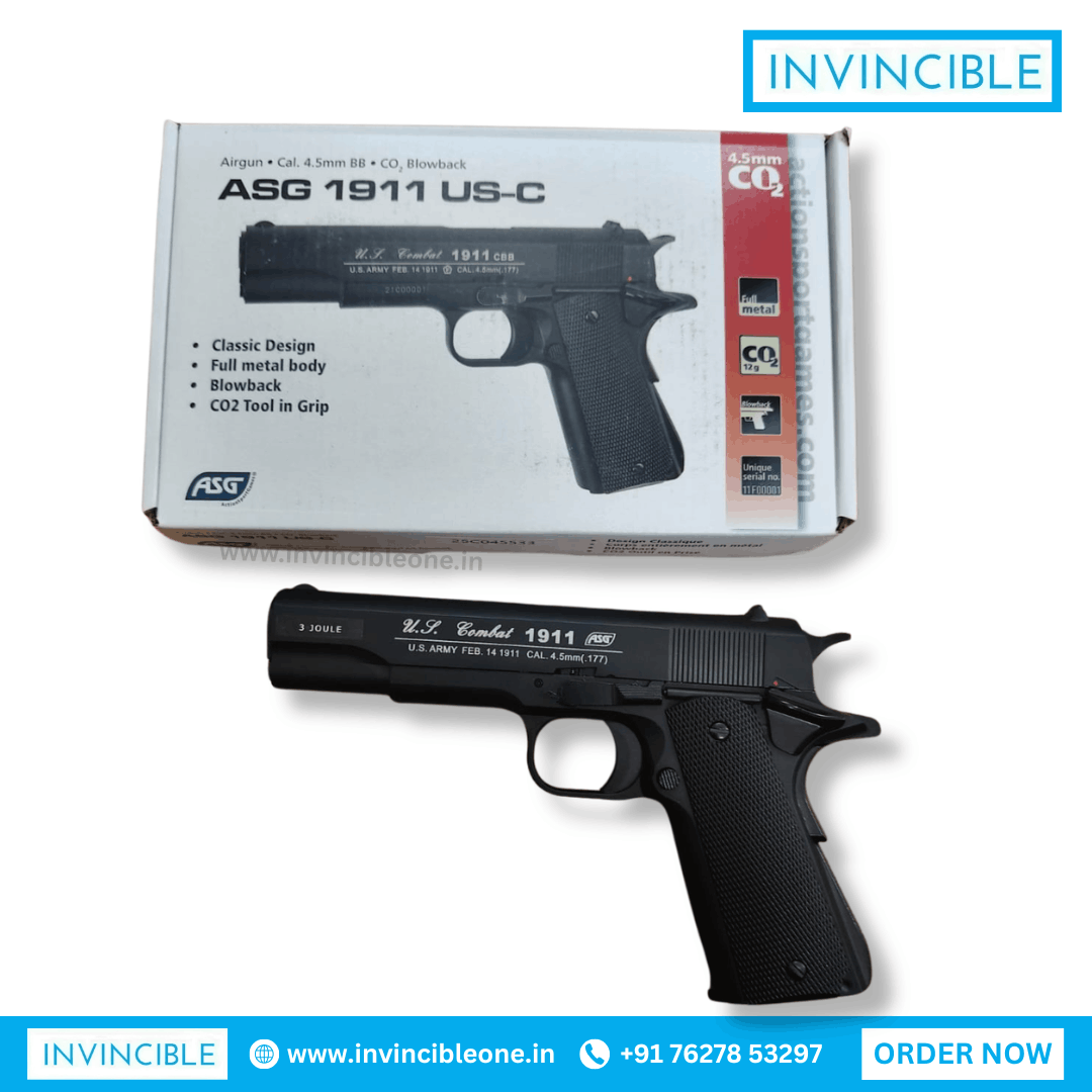 The ASG 1911 US-C CO₂ Blowback Air Pistol is a realistic full-metal .177 (4.5mm) BB airgun inspired by the classic 1911 design. Powered by a 12g CO₂ cartridge, it features strong blowback action, semi-automatic firing, and an 18-round magazine. Its solid metal build and dual safety system make it ideal for target practice and recreational shooting.