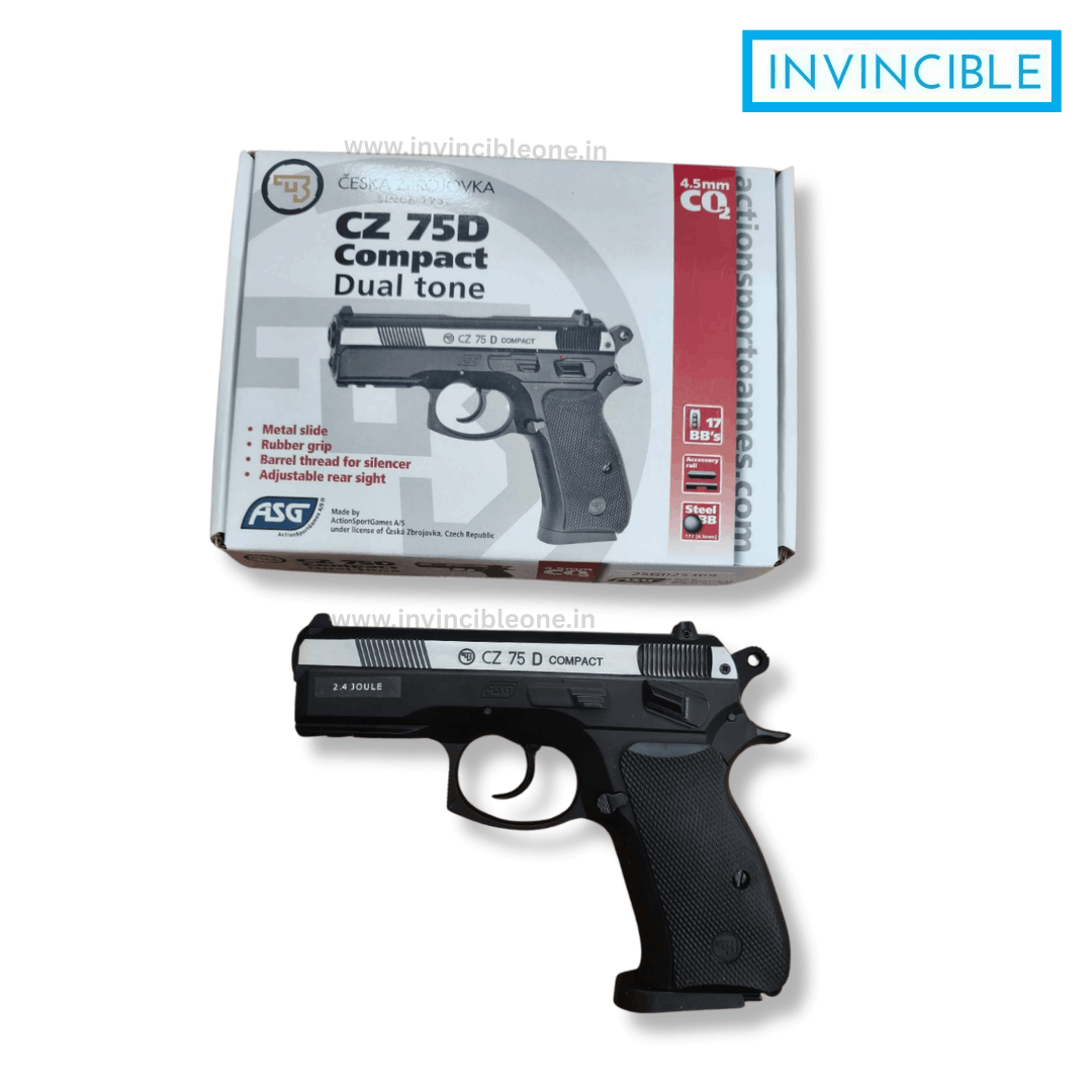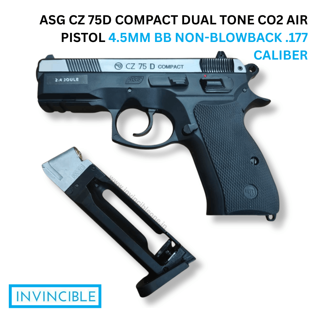 The ASG CZ 75D Compact Dual Tone CO₂ Air Pistol is a realistic licensed replica of the famous CZ handgun. Powered by a 12g CO₂ cartridge, this non-blowback 4.5mm BB air pistol offers reliable performance, good accuracy, and excellent gas efficiency. Its compact design, dual-tone finish, ergonomic rubber grip, and accessory rail make it ideal for target practice and recreational shooting.