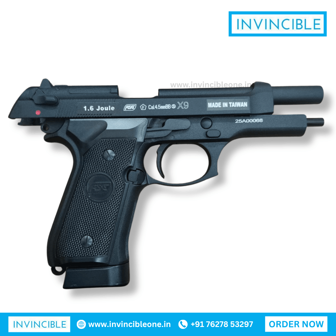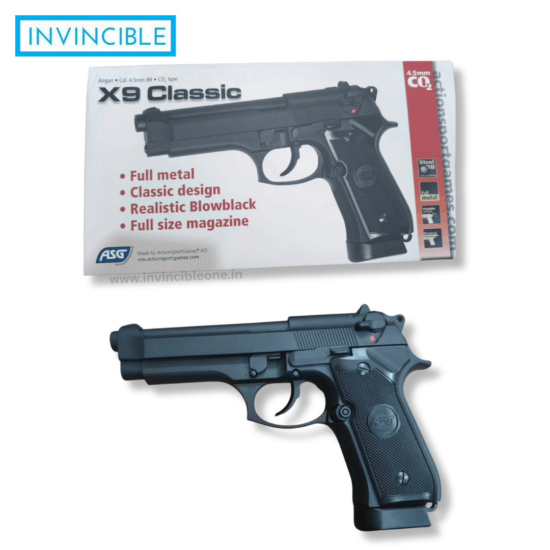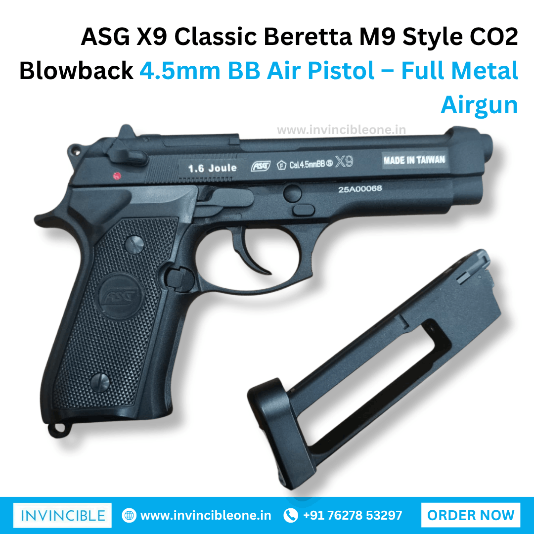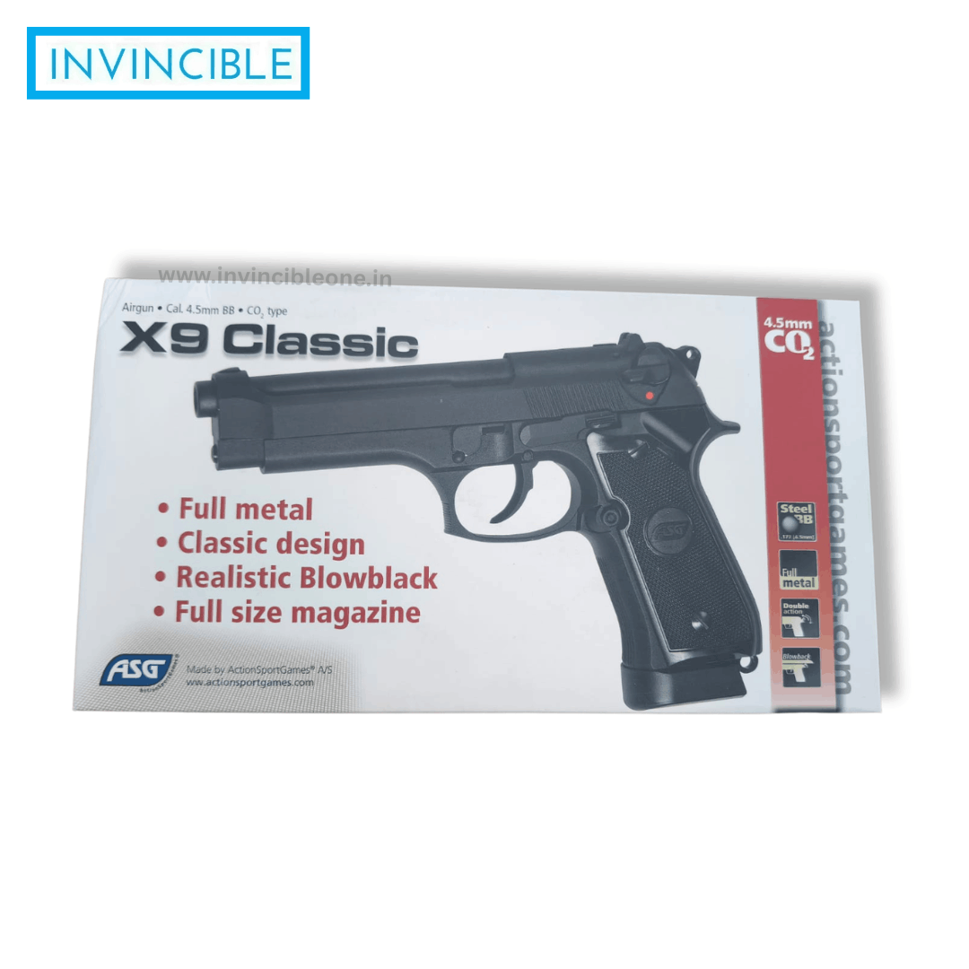 The ASG X9 Classic Beretta M9 Style CO₂ Blowback Air Pistol is a full-metal, realistic replica designed for target shooting and training practice. Powered by a 12g CO₂ cartridge, it delivers strong blowback action that mimics the recoil and slide movement of the original Beretta M9. With its solid metal construction, realistic weight, and smooth single/double-action trigger, the X9 Classic provides an authentic shooting experience for enthusiasts and collectors.